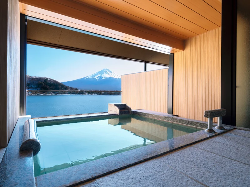 A Ryokan is a traditional Japanese inn that typically features tatami-matted rooms and hot communal baths/jacuzzis.